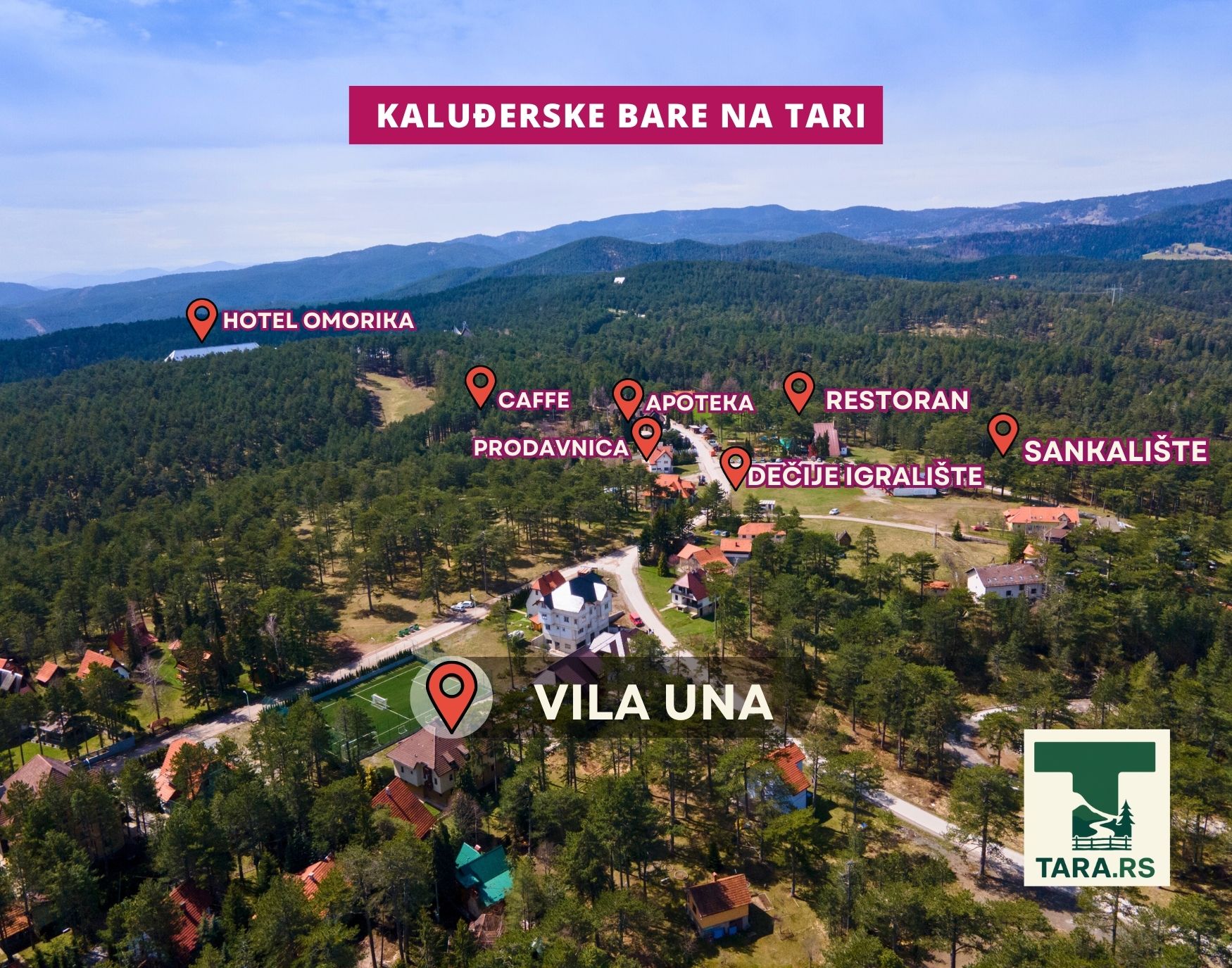 Villa UNA is located in the center of Kaluđerske Bare on Tara, 50 meters from the Jeremičak restaurant and 300 meters from the Omorika hotel and grocery stores.