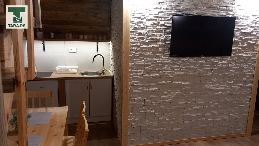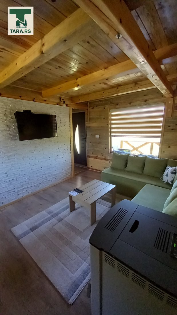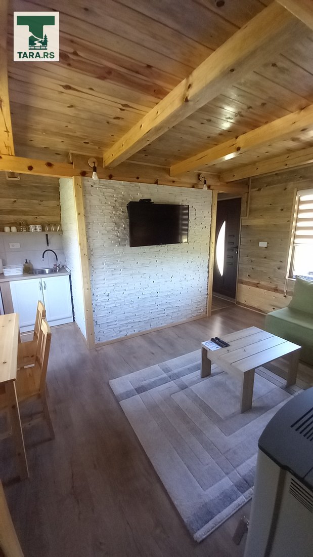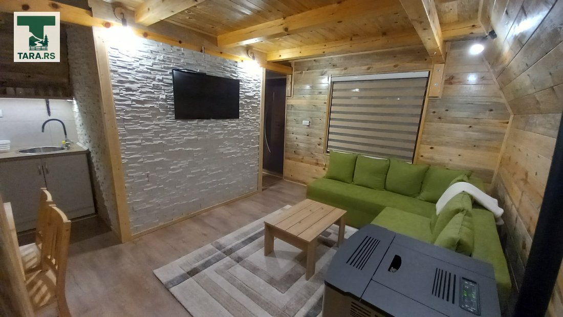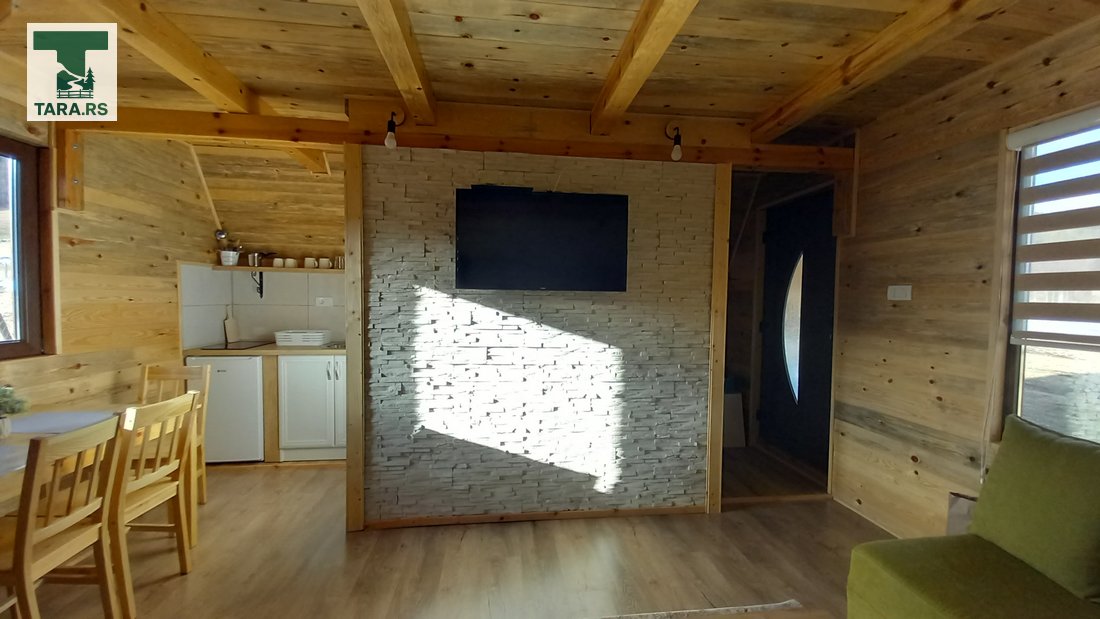 Svaka brvnara je za do 4 osobe i ima komplet opremljenu kuhinju, dnevni boravak i spavaću sobu sa